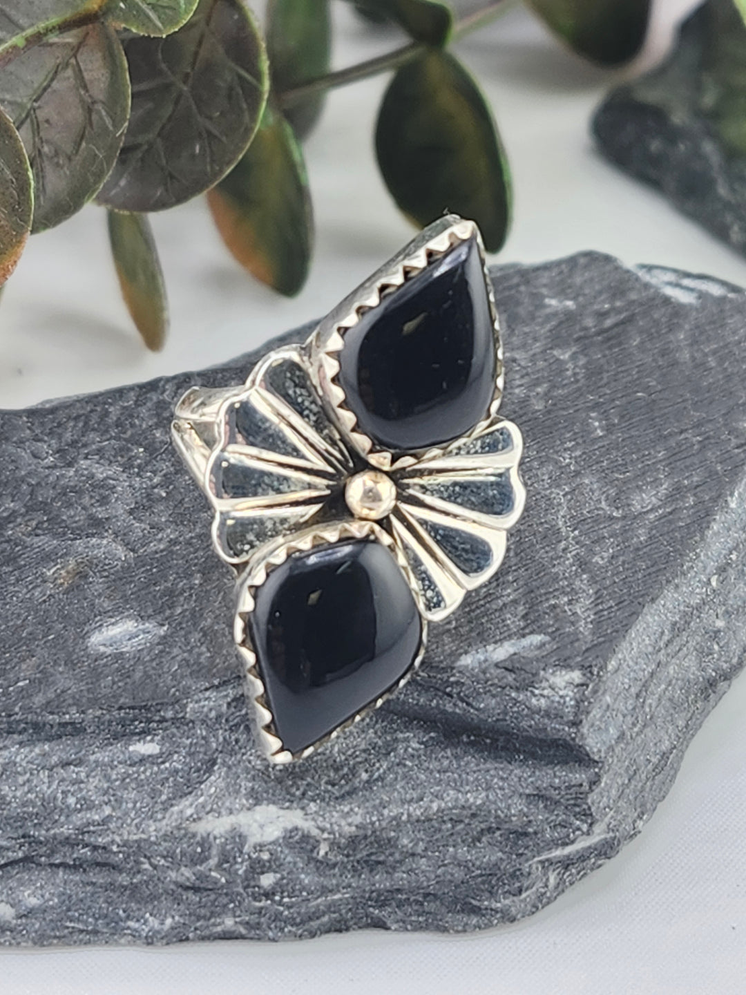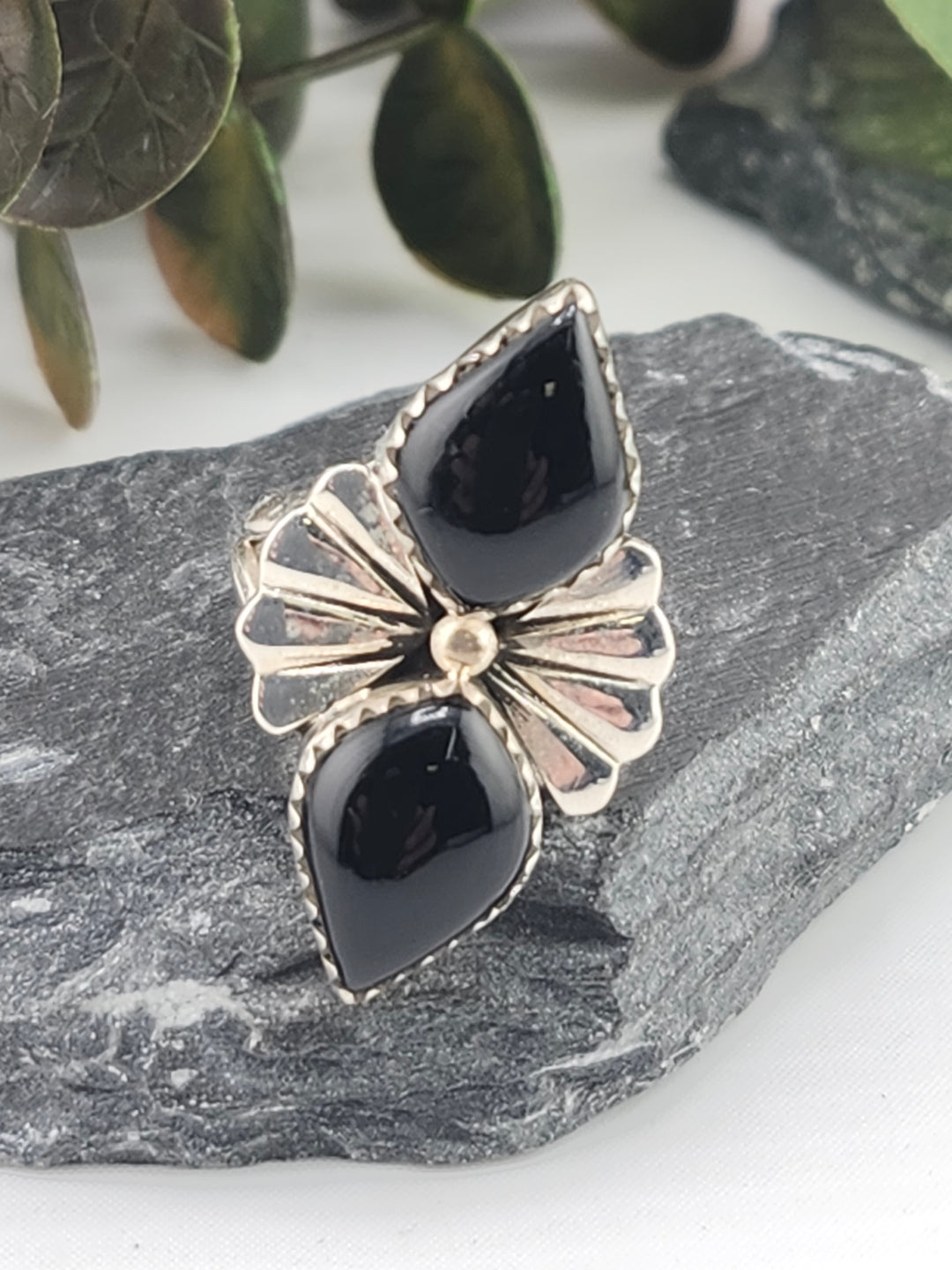 Black Onyx Double Stone and 925 Sterling Silver Ring - Size 6