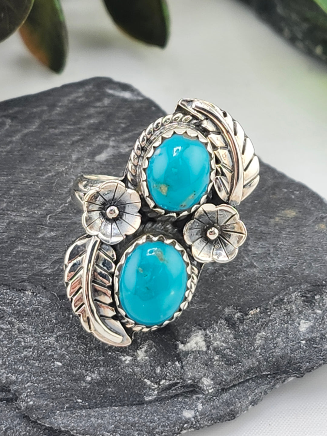 American Turquoise Double Stone and 925 Sterling Silver Ring - Size 7