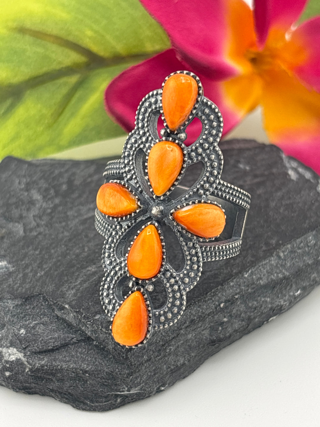 Orange Spiny Oyster Shell and 925 Sterling Silver Spider Ring - Size 7.25