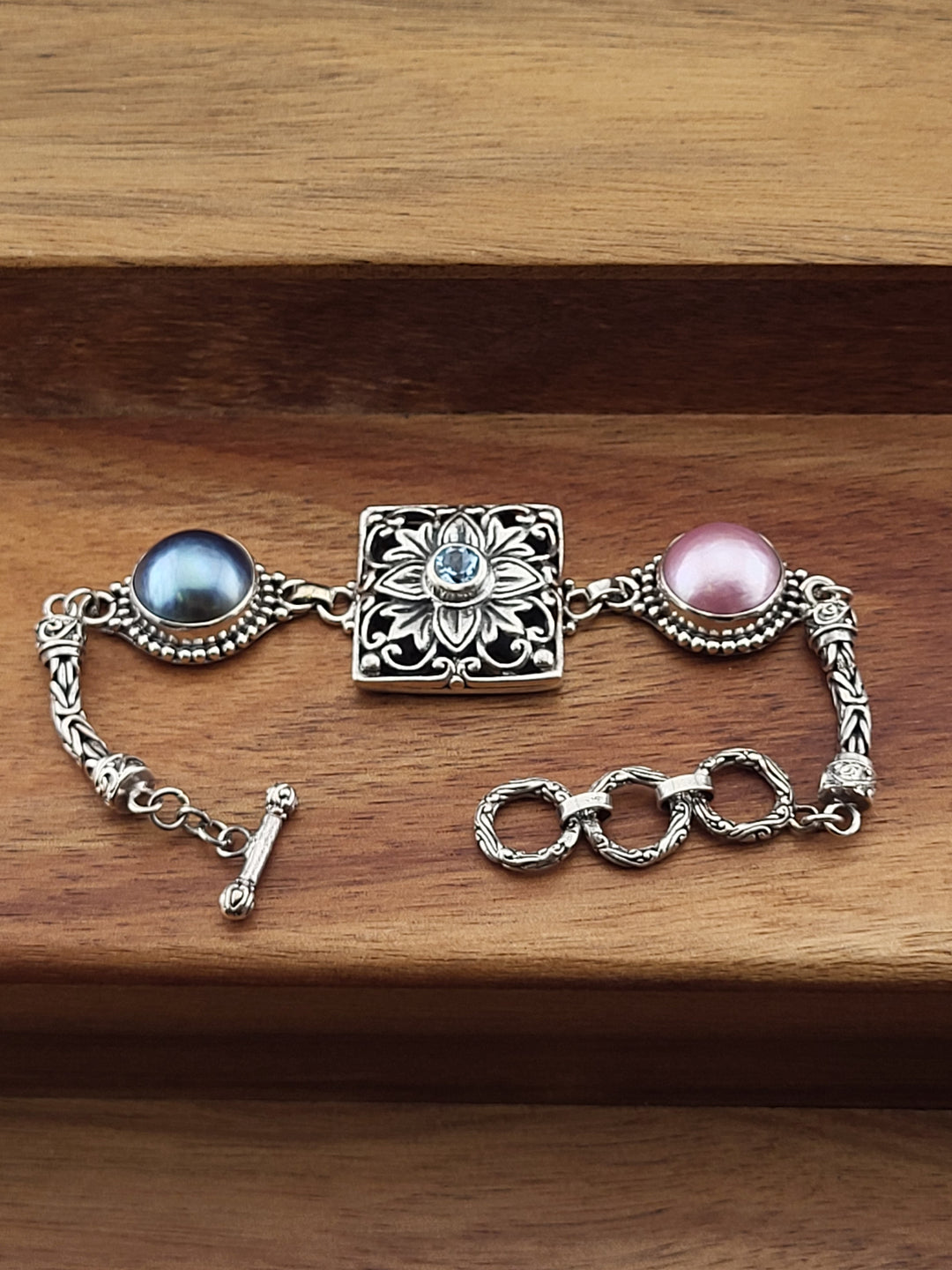 925 Sterling Silver 7'-8' Bali Bracelet w/ Natural Topaz and Blue & Pink Mabe Pearls