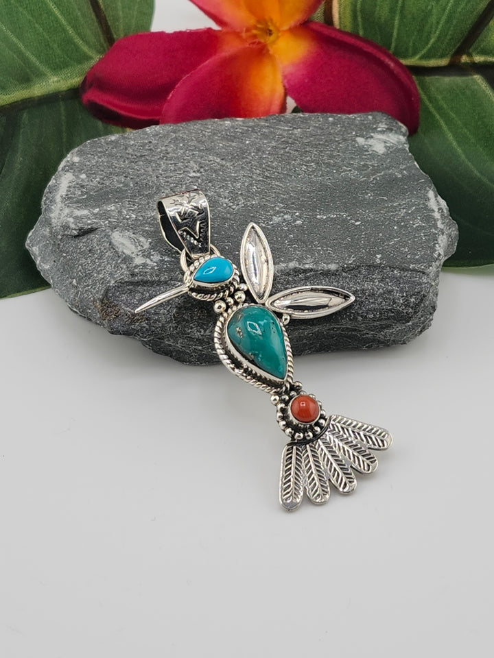 Turquoise & Italian Red Coral Hummingbird Pendant