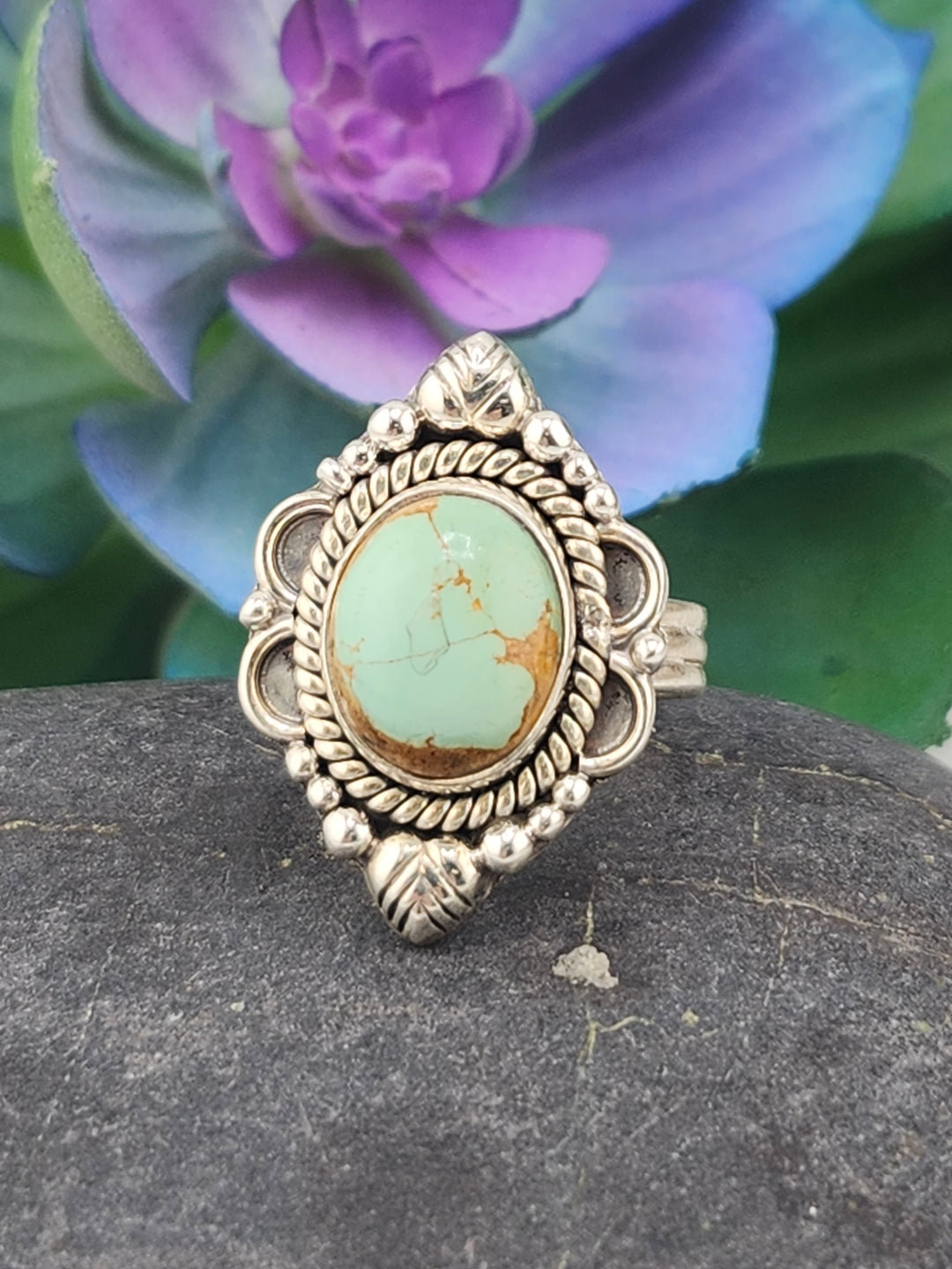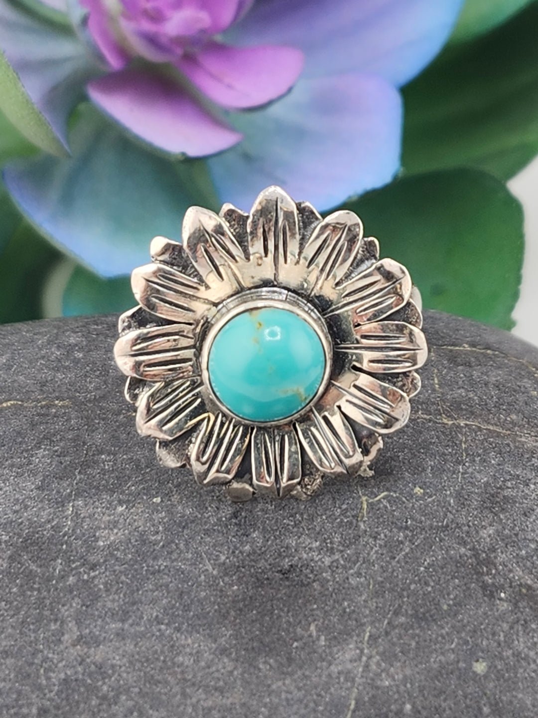 Kingman Turquoise and 925 Sterling Silver Flower Ring - Size 6.5