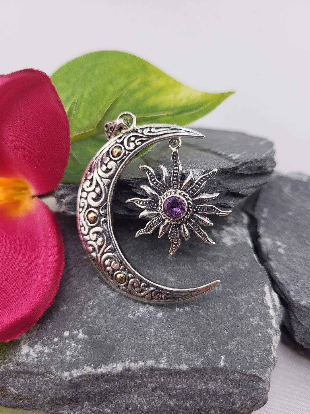 Bali Amethyst Star & 18k Accented Cresent Moon Pendant