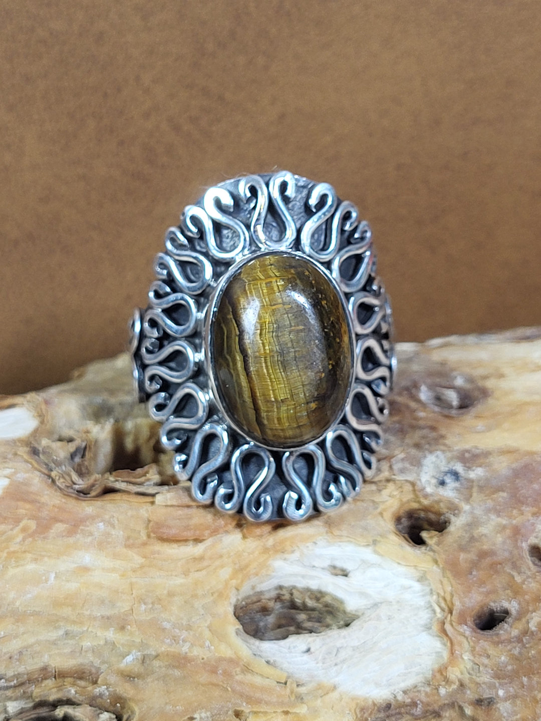 Natural Tiger's Eye 925 Sterling Silver Ring - Size 7 3/4