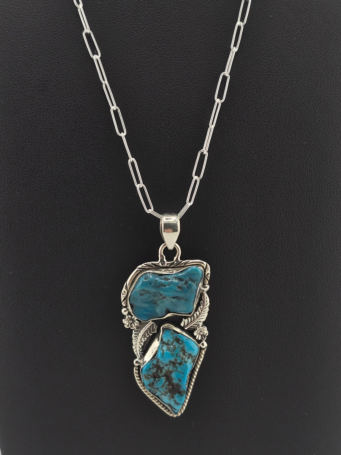 Raw Kingman Turquoise double stone 925 sterling silver pendant w/ 18" 3mm paperclip Chain