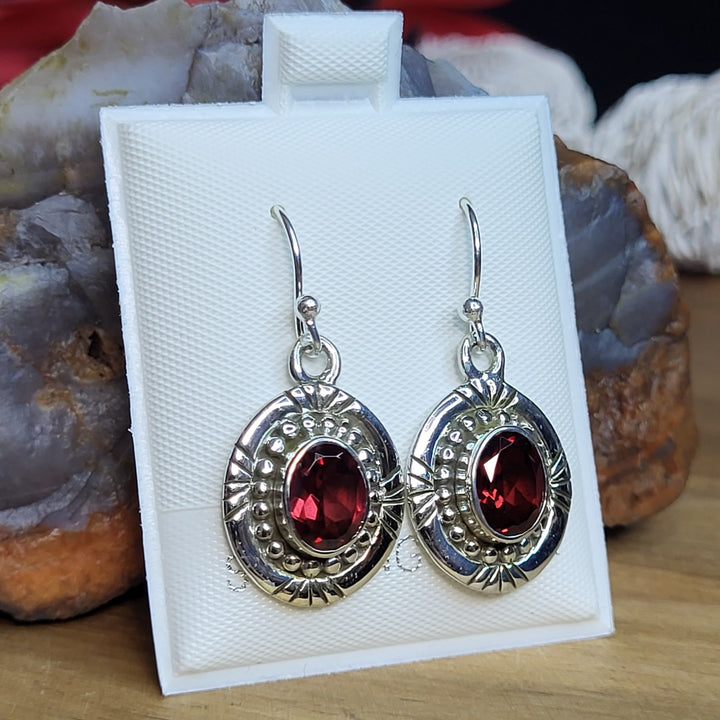 Introducing the Garnet 925 Sterling Silver Southwest Oval Dangles, a stunning addition to your jewelry collection. Crafted with care, these earrings feature genuine garnet gemstones set in high-quality 925 sterling silver. The oval shape adds a touch of elegance, while the Southwest-inspired design adds a unique and stylish flair. Perfect for any occasion, these dangles will effortlessly enhance your outfit and make a statement. Upgrade your style with the Garnet 925 Sterling Silver Southwest Oval Dangles.